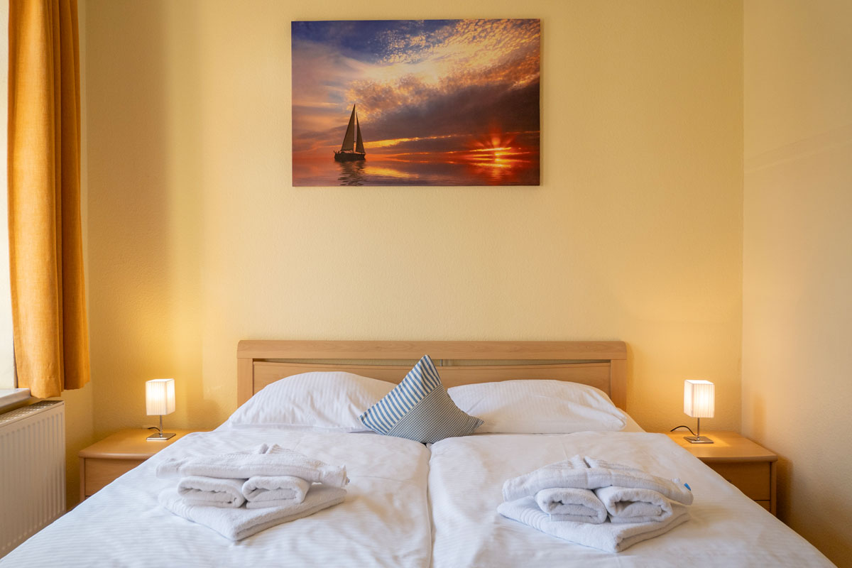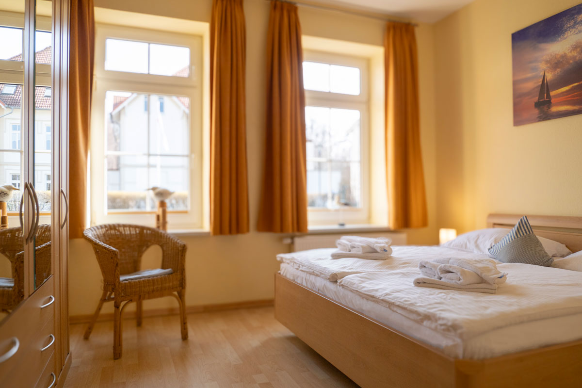 Die Wohnung 1 besteht aus einem großen Schlafzimmer mit Doppelbett und Kleiderschrank.