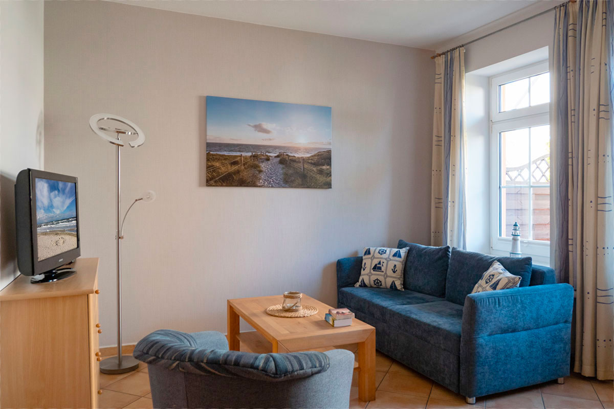 Ein großes Wohnzimmer mit Doppelschlafcouch und separater Einbauküche, ein Duschbad mit WC und ein Flur mit Garderobe ergänzen die Wohnung. Die Einrichtung ist komplett und freundlich gestaltet.