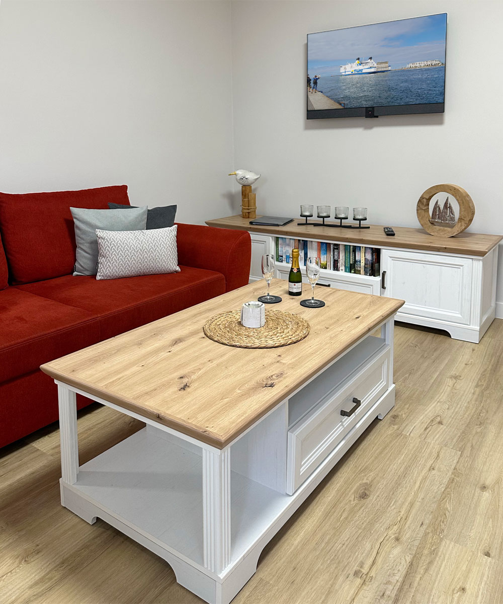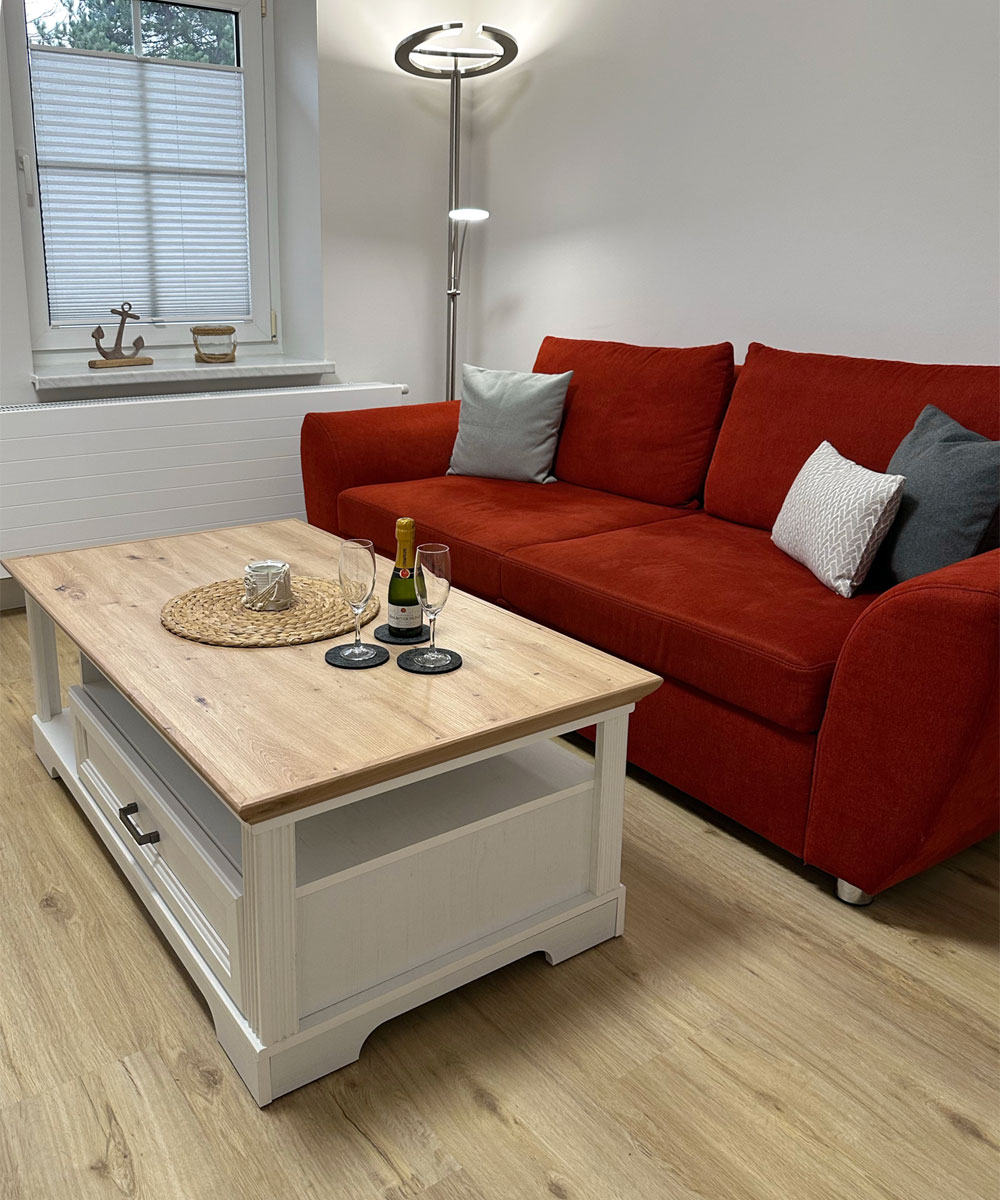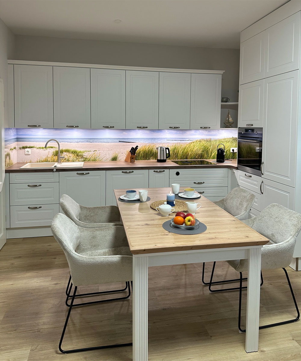 Das Ambiente der Ferienwohnung besticht durch nordischen Landhausstil mit hohem Komfort. Sie besteht aus einem Schlafzimmer mit Doppelbett und großzügigem Kleiderschrank. Eine gemütliche Sitzecke lädt hier zum Entspannen ein. Im geschmackvoll gestalteten Wohnraum mit Sitzecke und separater hochwertig komplett ausgestatteter Einbauküche werden Sie sich wohlfühlen. Ein modernes Duschbad mit WC und ein Flur mit Garderobe und großem Spiegel ergänzen die Wohnung.