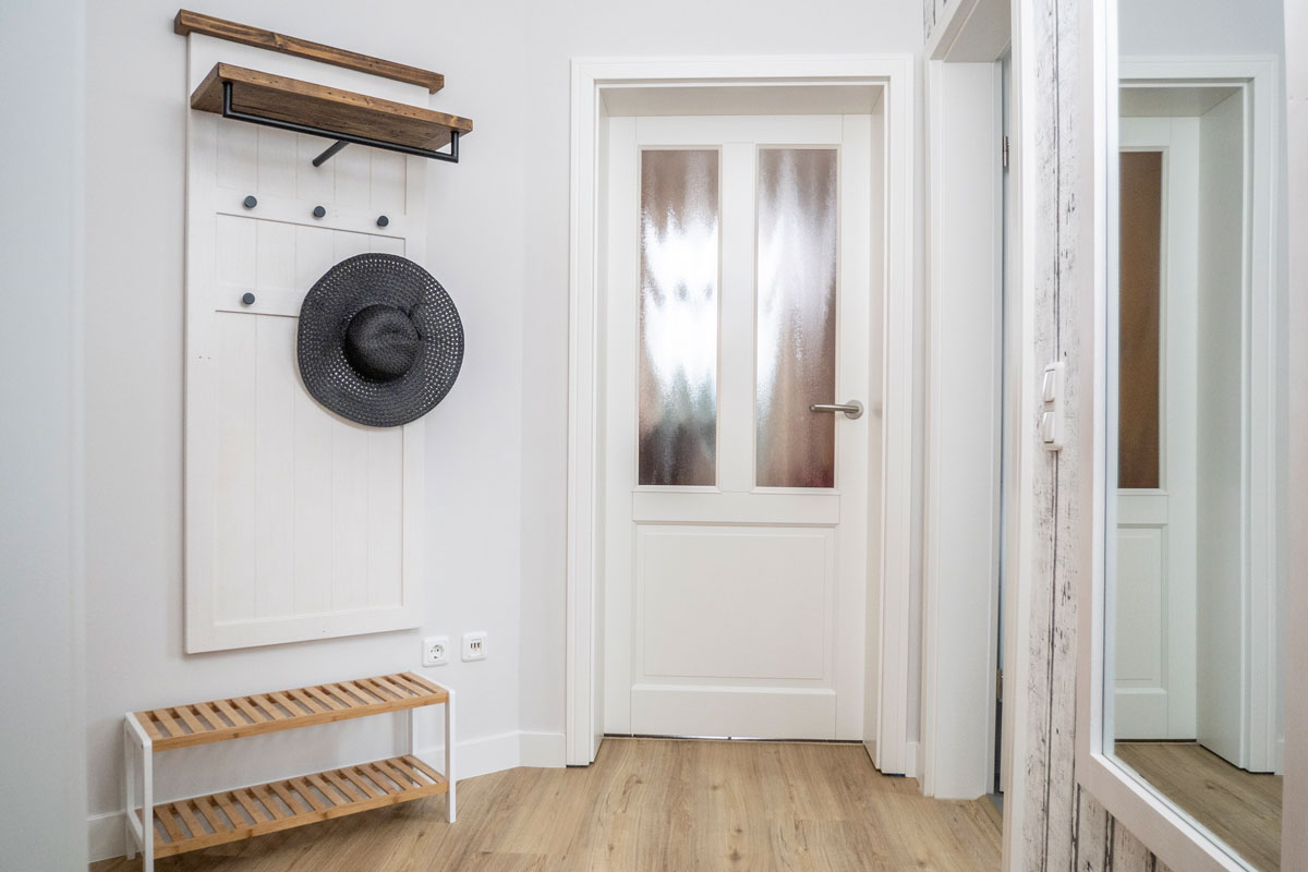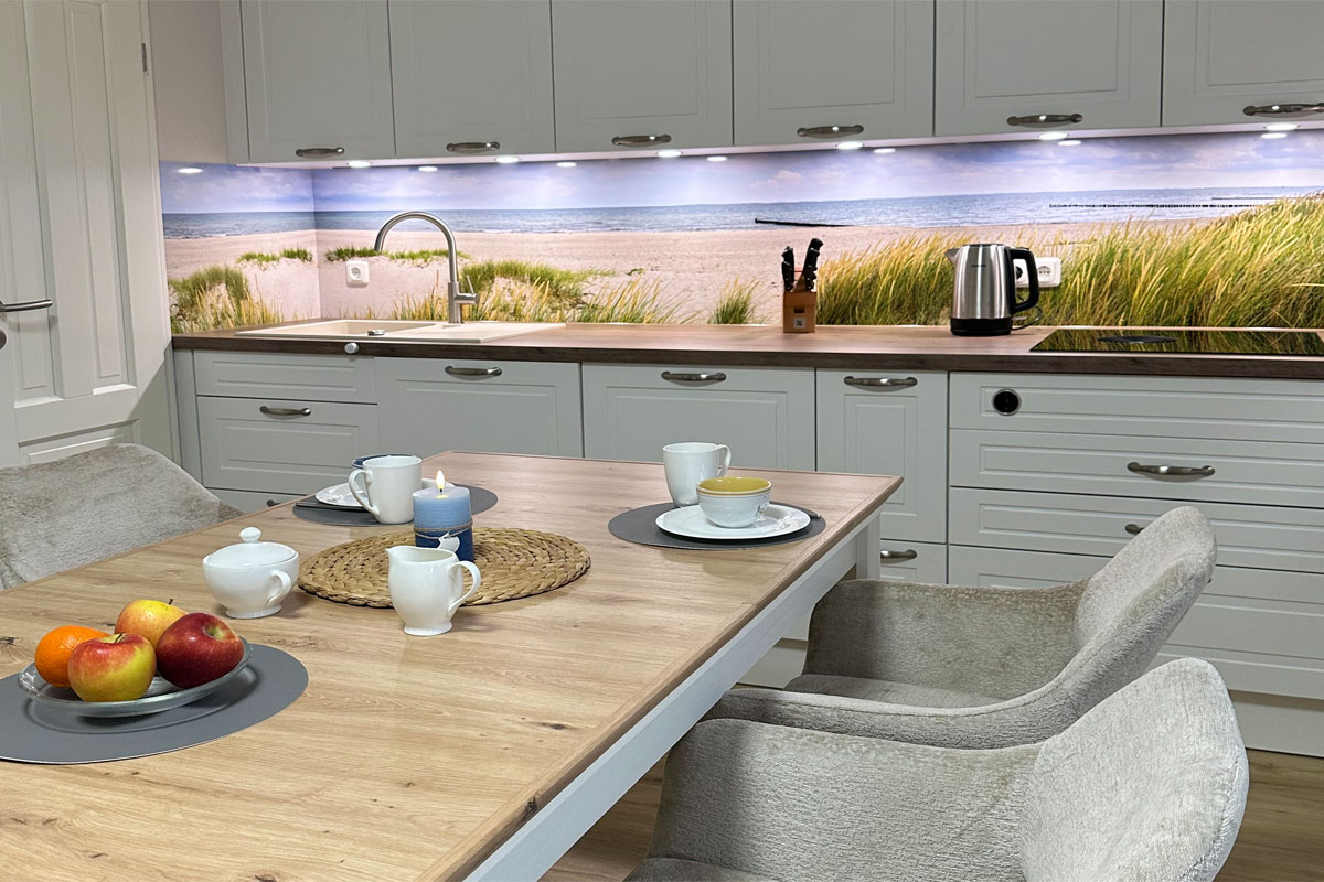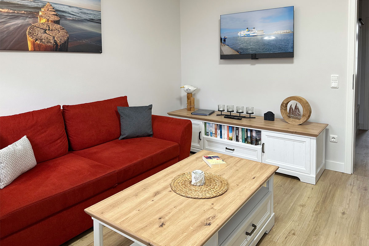 Das Ambiente der Ferienwohnung besticht durch nordischen Landhausstil mit hohem Komfort. Sie besteht aus einem Schlafzimmer mit Doppelbett und großzügigem Kleiderschrank. Eine gemütliche Sitzecke lädt hier zum Entspannen ein. Im geschmackvoll gestalteten Wohnraum mit Sitzecke und separater hochwertig komplett ausgestatteter Einbauküche werden Sie sich wohlfühlen. Ein modernes Duschbad mit WC und ein Flur mit Garderobe und großem Spiegel ergänzen die Wohnung.