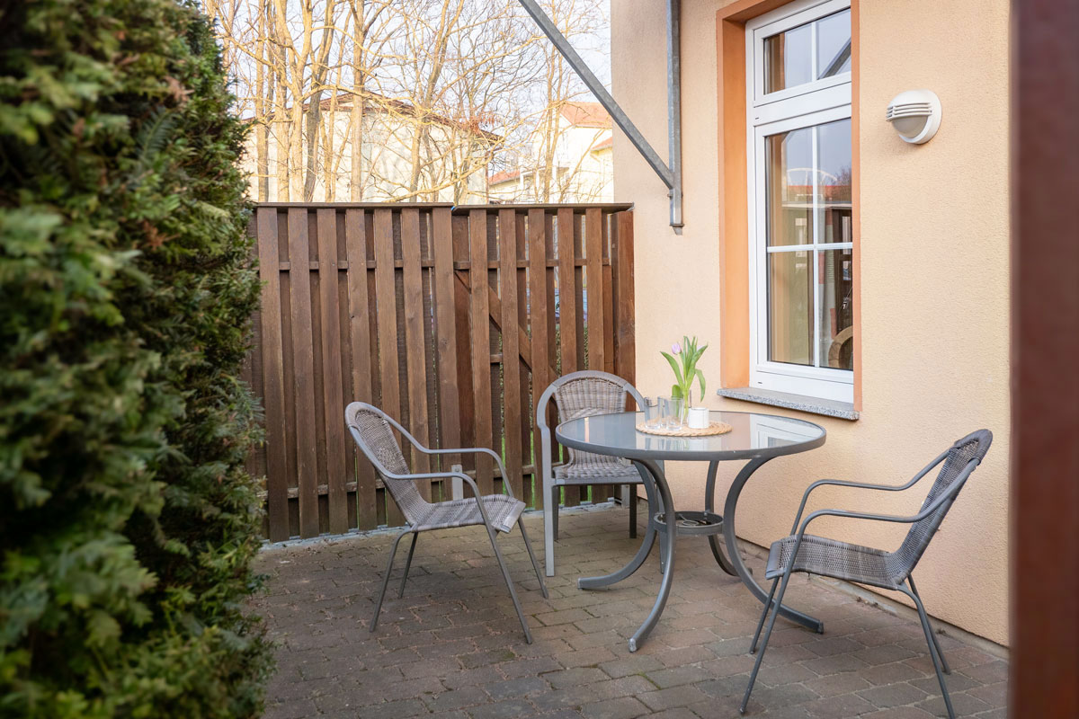 Die Wohnung verfügt über eine Terrasse mit Gartenmöbeln und ist durch stufenfreie Gestaltung besonders seniorengerecht.