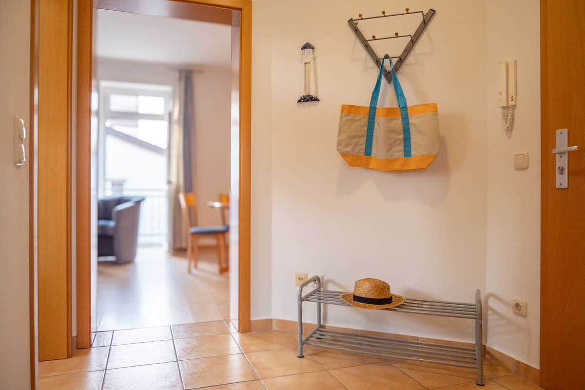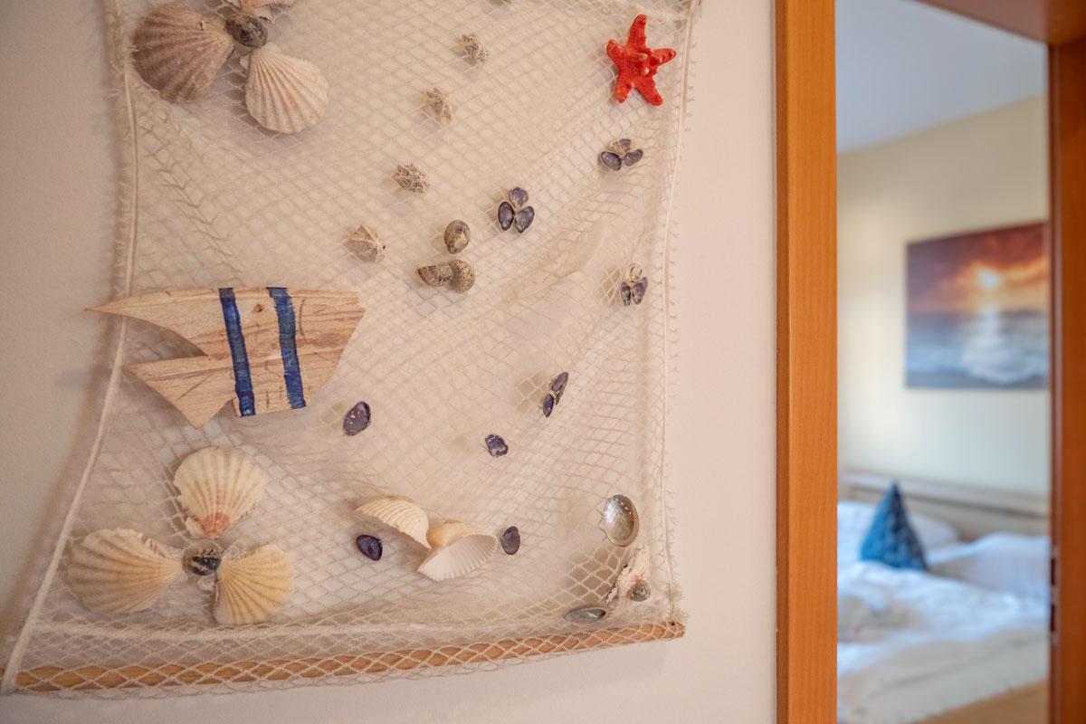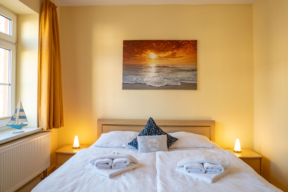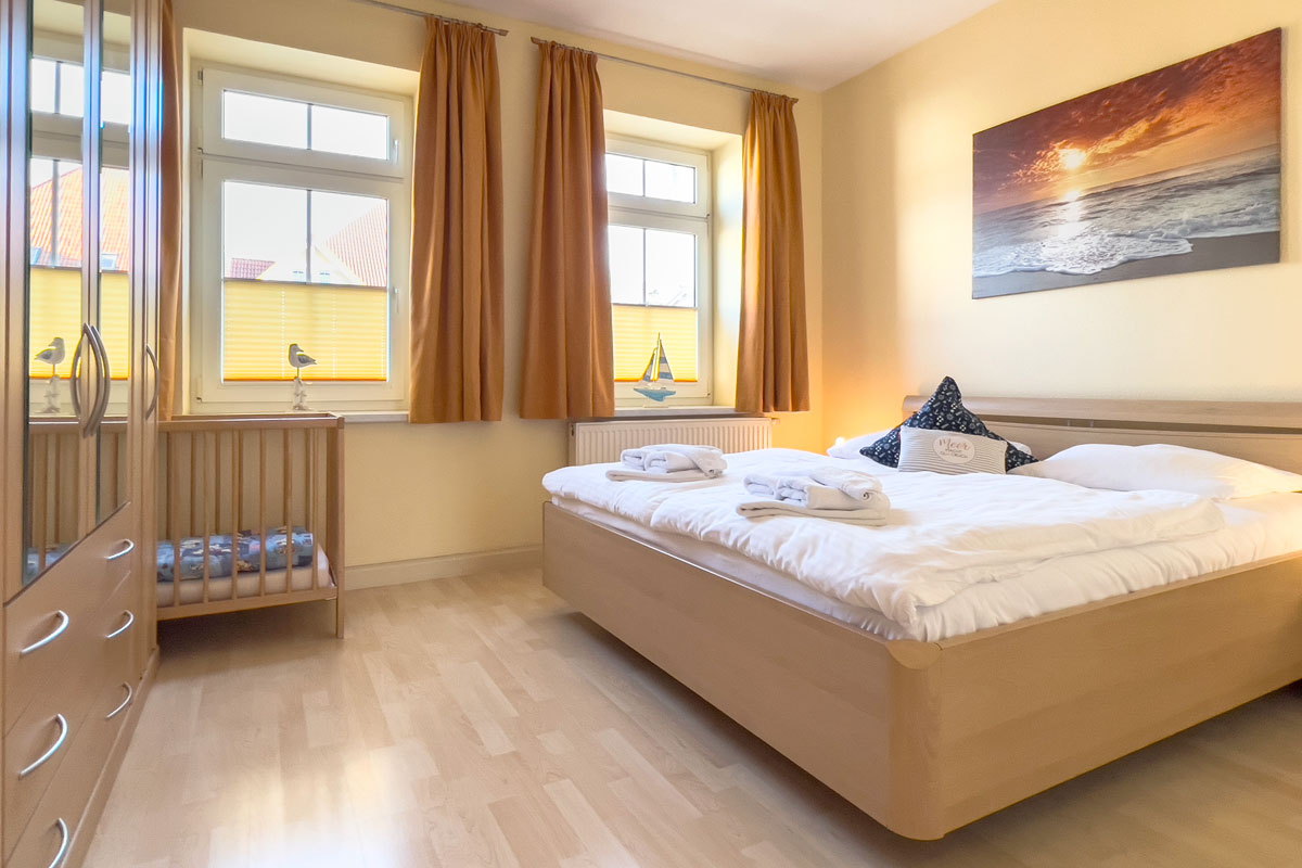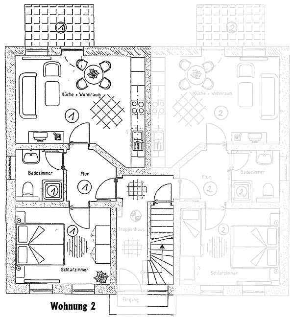 Die Wohnung 2 besteht aus einem großen Schlafzimmer mit Doppelbett und Kleiderschrank sowie einem großen Wohnzimmer mit Doppelschlafcouch und separater, kompletter Einbauküche. Ein Duschbad mit WC und ein Flur mit Garderobe ergänzen die Wohnung. Die Einrichtung ist komplett und freundlich gestaltet. Die Wohnung verfügt über einen Balkon mit Gartenmöbeln.